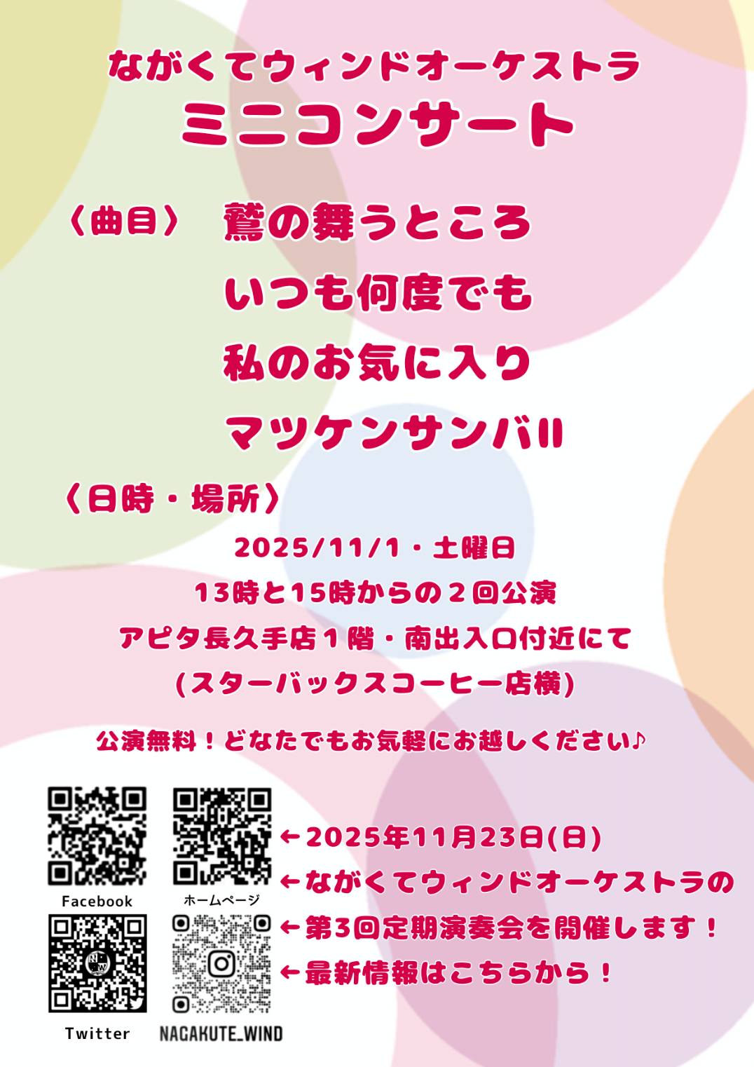 ながくてウィンドオーケストラは、2021年10月に誕生した一般吹奏楽団です。長久手市を中心とした周辺地域で練習・演奏会を行っており、吹奏楽曲からポップスまで、多くの方に親しんでもらえる曲を中心に取り組んでいます。